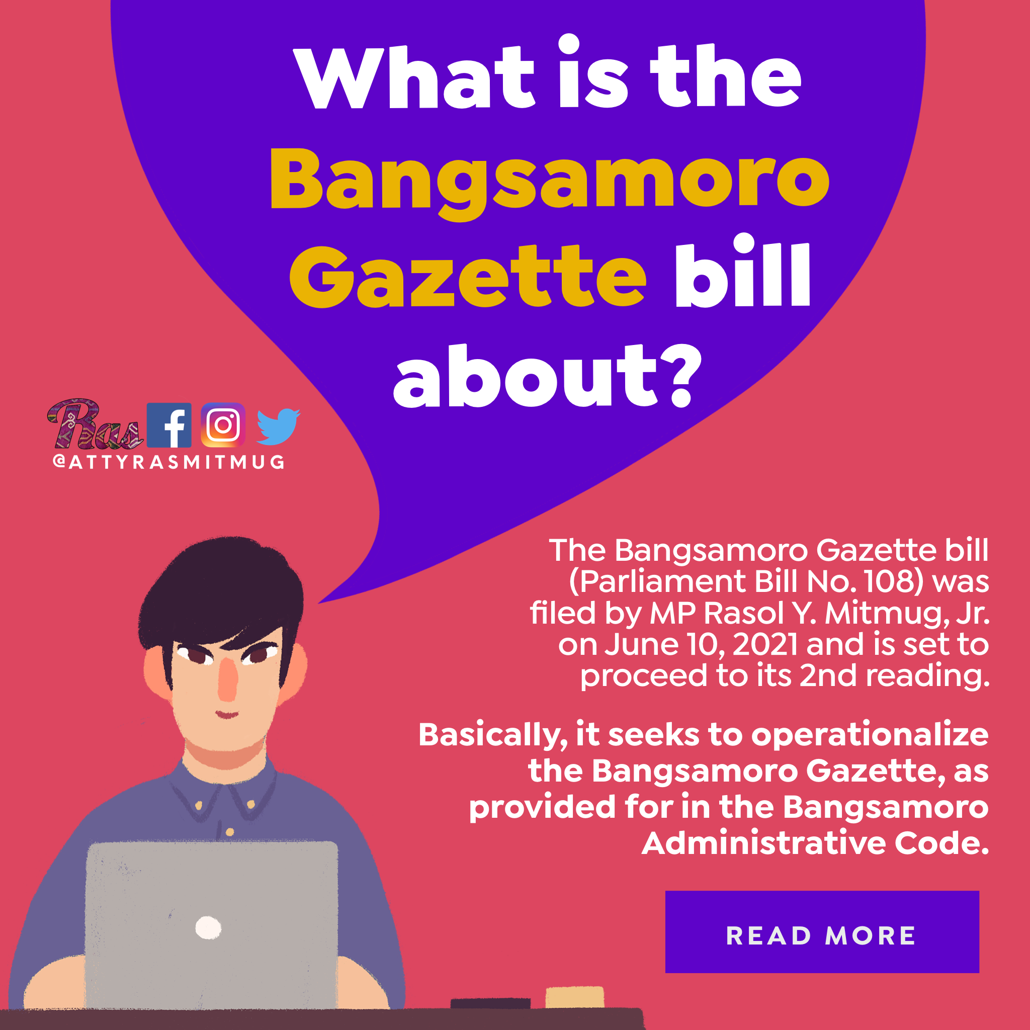 Parliament Bill No. 108, otherwise known as the Bangsamoro Gazette bill, was filed by MP Rasol Y. Mitmug, Jr. on June 10, 2021, and will proceed to its 2nd reading in the Bangsamoro Parliament at the 63rd plenary session.