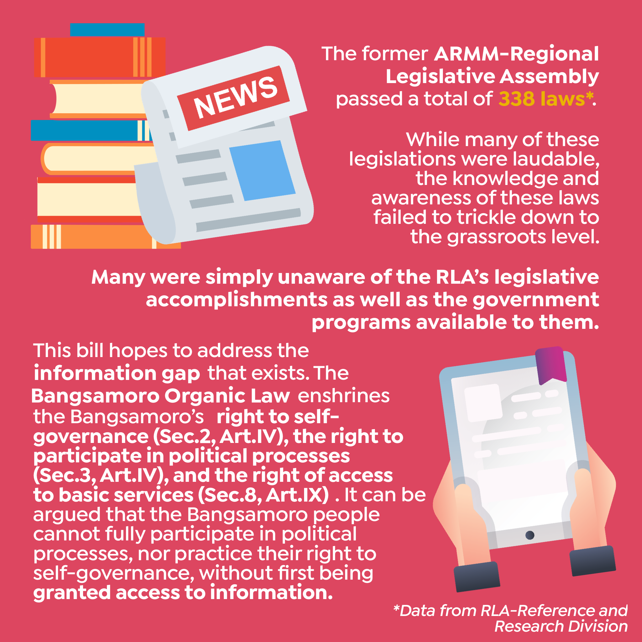 This bill hopes to address the information gap that exists. The Bangsamoro Organic Law enshrines the Bangsamoro’s right to self-governance, the right to participate in political processes, and the right of access to basic services.