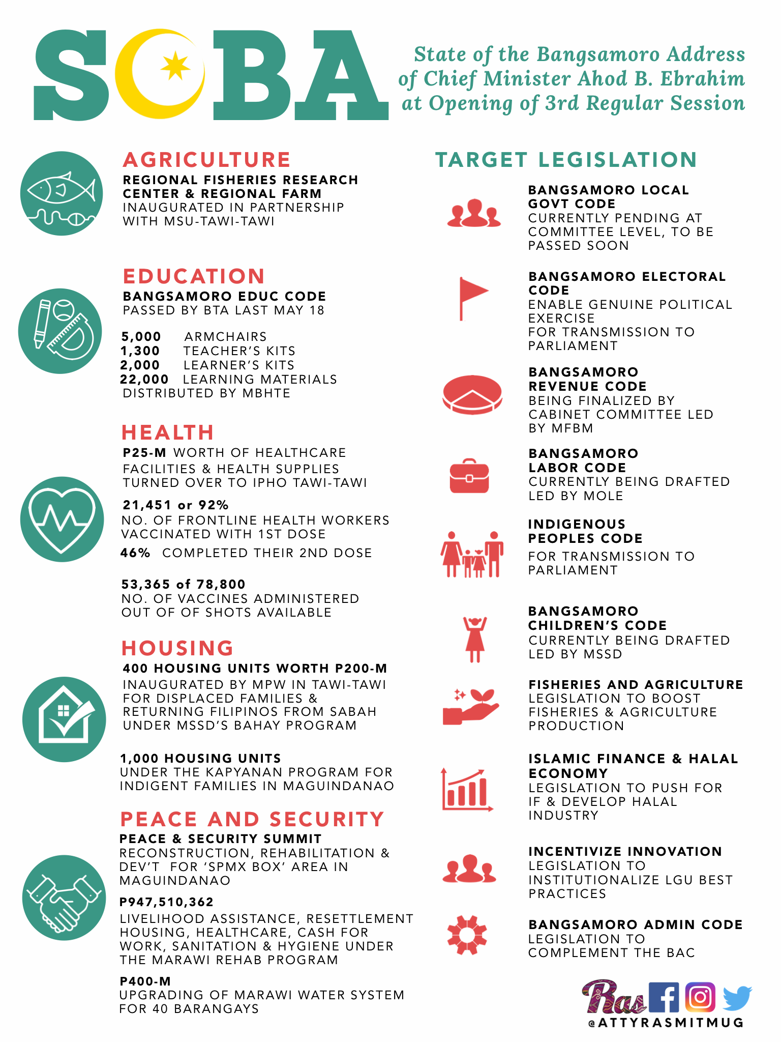 Various infrastructure projects were also inaugurated such as the two story dormitory to be built by the Ministry of Public Works in MSU Tawi-Tawi, 400 housing units worth 200 million for indigent displaced families and returning Filipinos from SABAH (REFS) under the Bangsamoro Housing Assistance Program (BAHAY Program) of the Ministry of Social Services and Development.